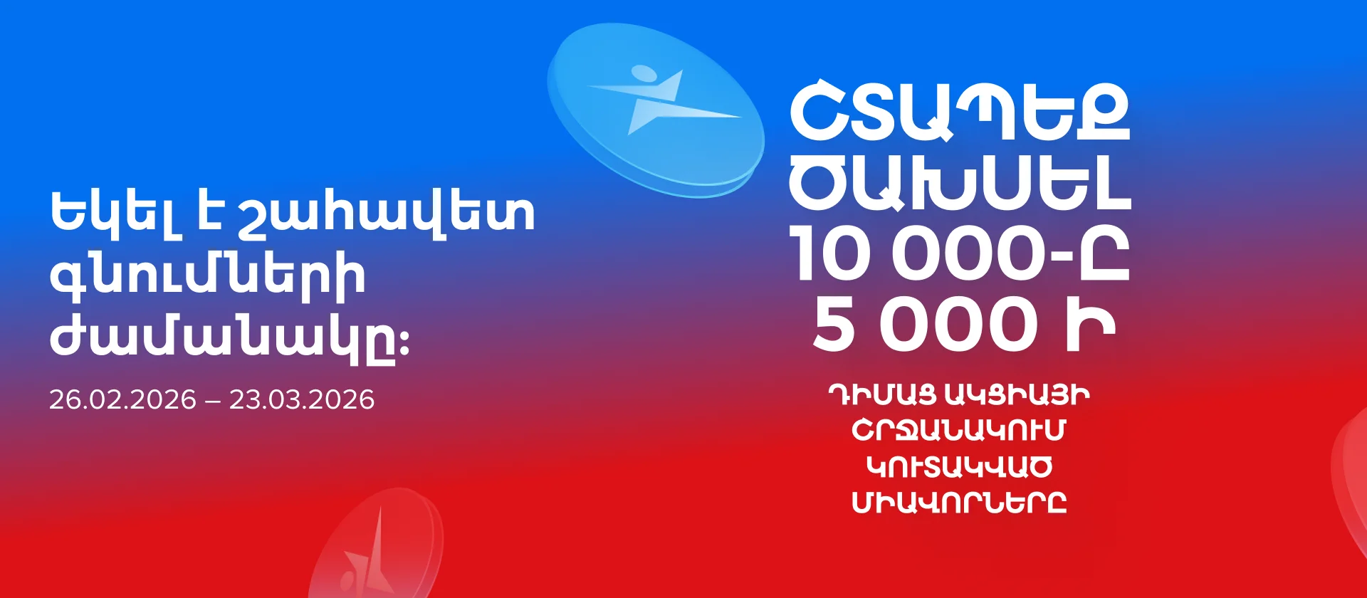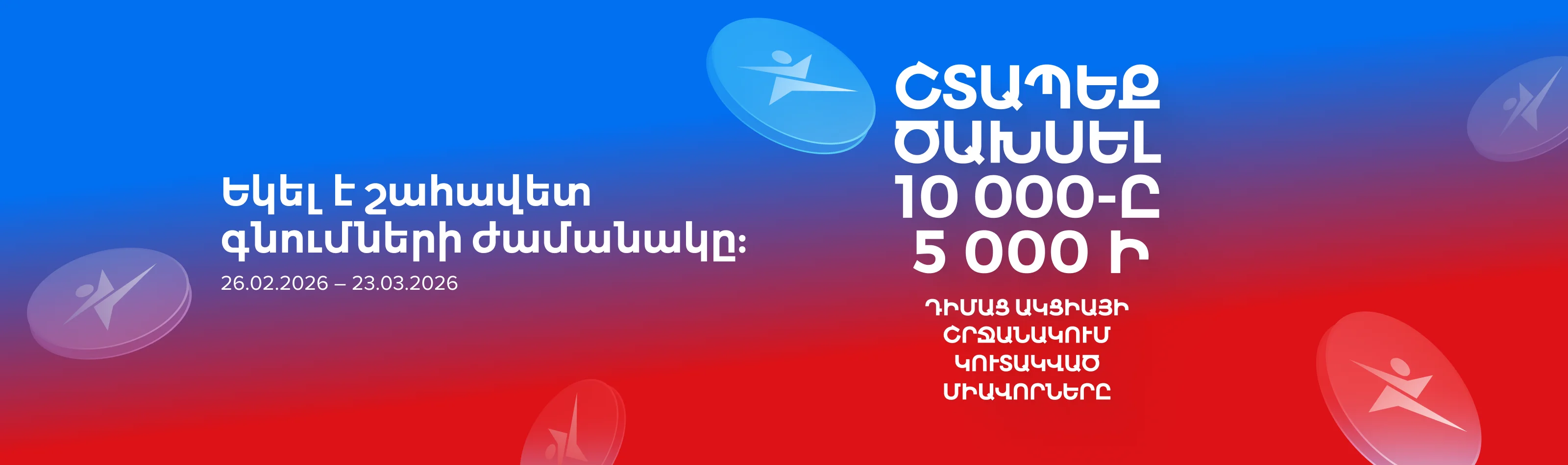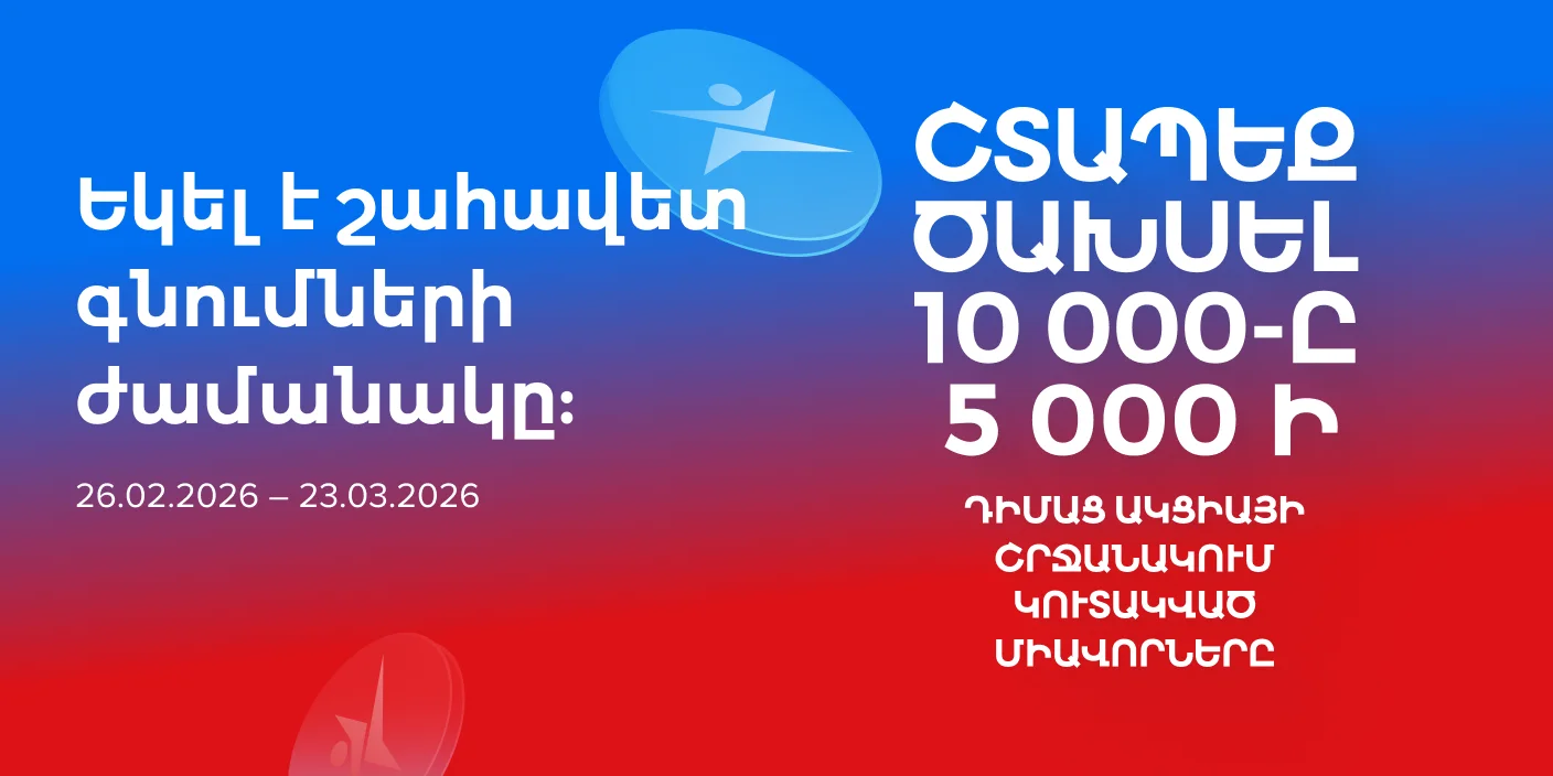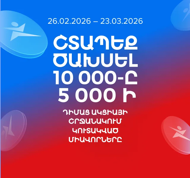 «10000 միավոր՝ 5000 դրամից սկսած ցանկացած գնման դեպքում» ակցիայի (ակցիան գործում է 11.12.2025-ից մինչև 19.01.2026 -ը ներառյալ) պայմանների համաձայն՝ 26.02.2026-ին «Սպորտմաստեր» Ակումբային ծրագրի մասնակիցների բոնուսային հաշիվներին հաշվեգրվում է 10000 Պրոմո միավոր։ Ակցիայի միավորներով կարելի է 26.02.2026-ից մինչև 23.03.2026-ը ներառյալ «Սպորտմաստեր» խանութներում վճարել ցանկացած ապրանքի և ծառայության գնի մինչև 30%-ը (ներառյալ) (բացառությամբ՝ Նվեր քարտերի, «Լավագույն գին» մակնշմամբ և դեղին գնապիտակներով ապրանքների)՝ 1 Պրոմո միավորը համարժեք է 1 դրամի հաշվարկով։ Առավելագույն զեղչը չի կարող գերազանցել ապրանքի ամբողջական արժեքի 50% - ը: Միավորների դրամային համարժեքը չի տրամադրվում։ Ակցիայի մասին մանրամասն տեղեկատվությունը ճշտե՛ք «Սպորտմաստեր» խանութների աշխատակիցներից։ Կազմակերպիչ՝ «Սպորտմաստեր» ՍՊԸ, ՀՎՀՀ՝ 00212205: